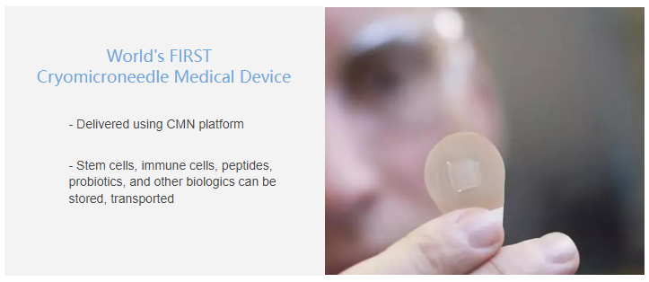 World's FIRSTCryomicroneedle Medical Device- Delivered using CMN platform - Stem cells, immune cells, peptides, probiotics, and other biologics can be stored, transported |